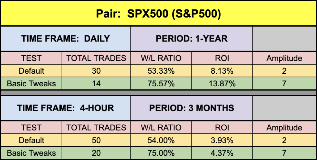 As No Nonsense Traders – and therefore Swing Traders, we will not examine shorter time frames in these studies. We will also run an additional test, using different values for the settings, to analyze which one may work better and examine the following results: