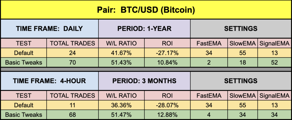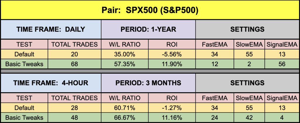 The green highlighted rows represent “basic tweaks” on the settings which returned better results. Are these the best? Not necessarily. Given that variables including testing date range and broker data are different from person to person, you may find better settings.