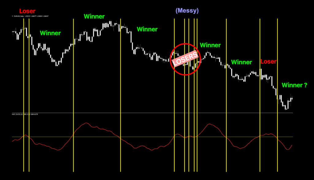 There were winners, and losers…and of course that one really messy area to the right of center. This is where your algorithm would have kept you on the sidelines until the market decided where it wants to go. Remember the bit earlier about not using this as a reversal or divergence indicator? Steer clear of that and let your algorithm do its thing.