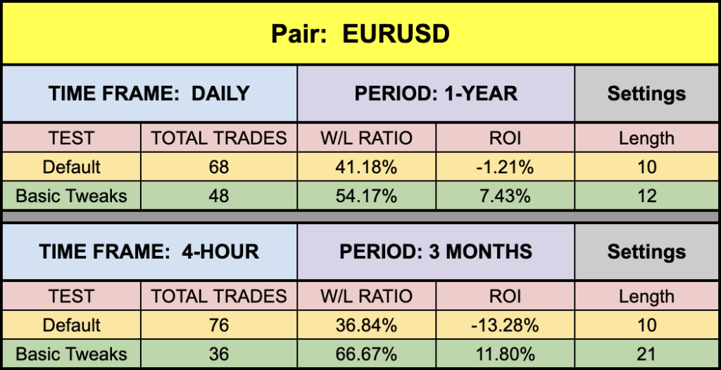 The green highlighted rows represent “basic tweaks” on the settings which returned better results. Are these the best? Not necessarily. Given that variables including testing date range and broker data are different from person to person, you may find better settings.