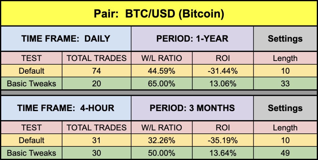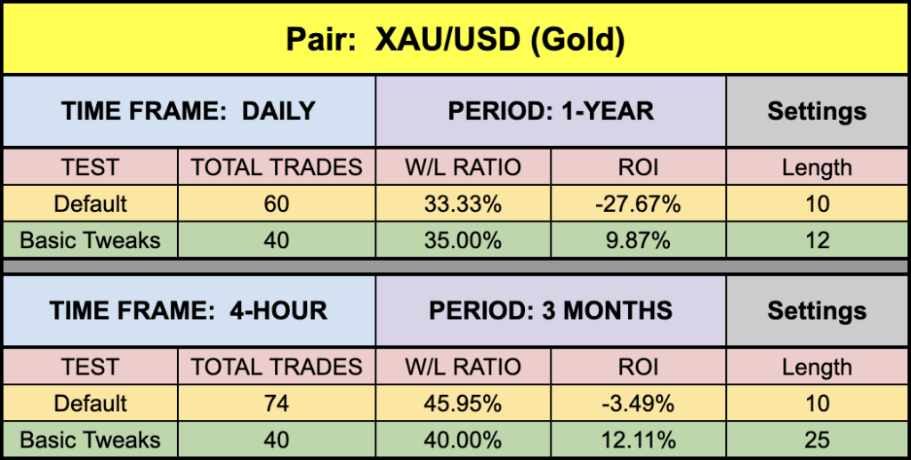 As No Nonsense Traders – and therefore Swing Traders, we will not examine shorter time frames in these studies. We will also run an additional test, using different values for the settings, to analyze which one may work better and examine the following results: