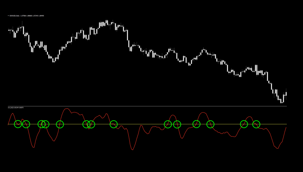 As the title suggests, the Center of Gravity indicator is classified as a confirmation indicator and is a single level (zero cross) that occupies the space below your price chart window. At first glance, it doesn’t look that way, but bear with us.