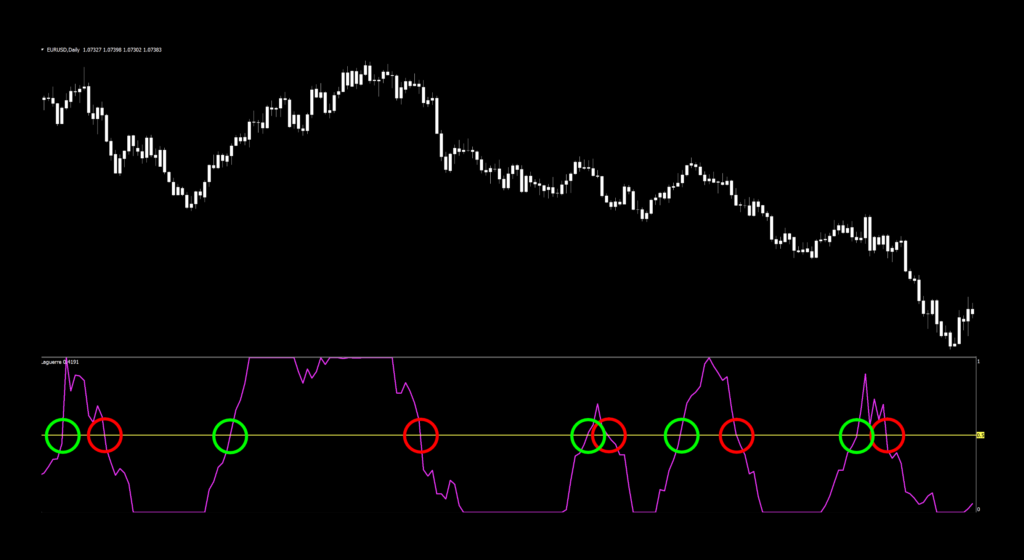 This indicator falls into the category of an oscillating mid-line cross, sometimes called a zero-cross…but in this particular instance the midline is, 0.5 and finds itself below your chart and can serve as either your C1 or C2, depending on what your second indicator is.