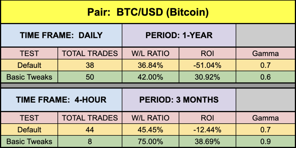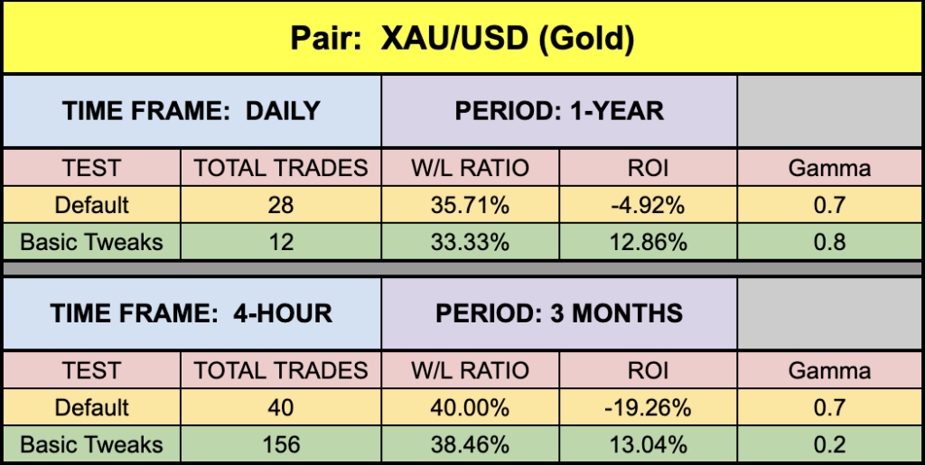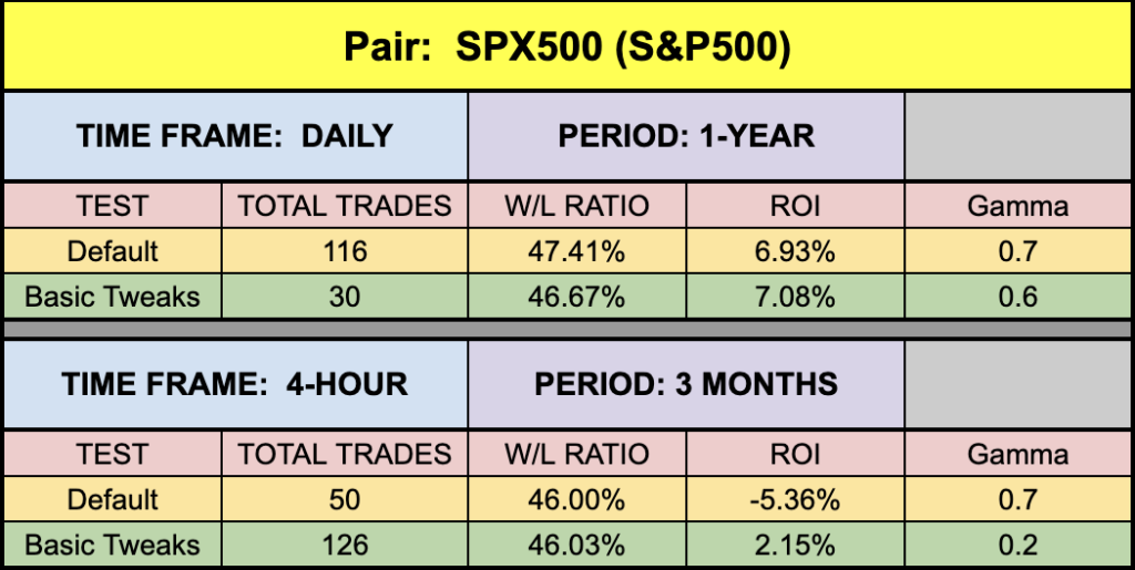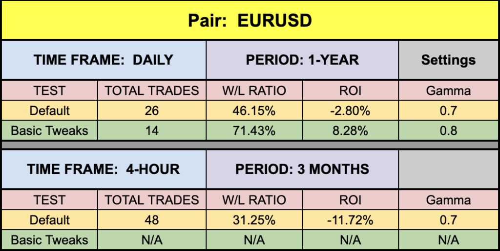 The green highlighted rows represent “basic tweaks” on the settings which returned better results. Are these the best? Not necessarily. Given that variables including testing date range and broker data are different from person to person, you may find better settings.