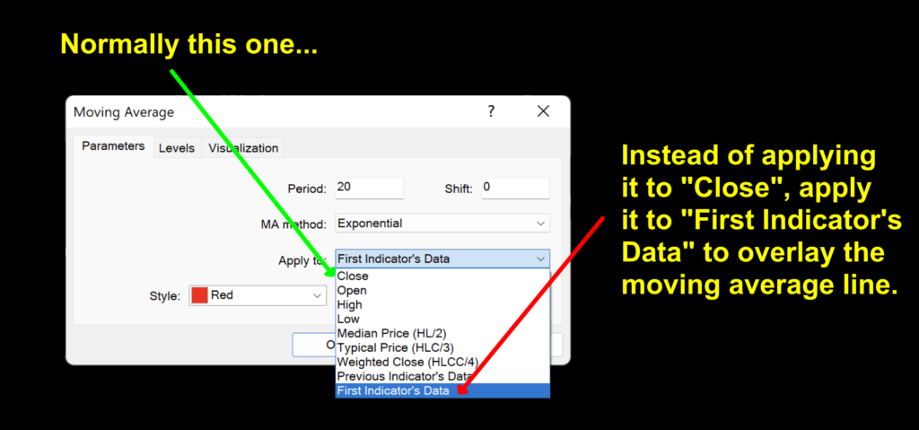 You’re going to add a moving line to the chart from the indicator menu on your platform – one that comes pre-installed. The cool thing here is that you now have more variables to play with. What kind of moving average line do you want? What period do you want to use? A new playground!