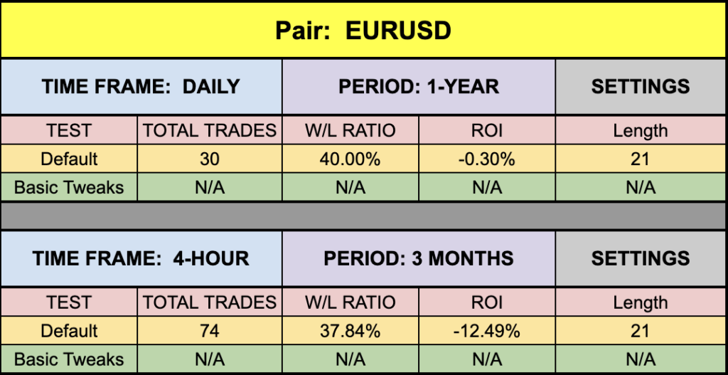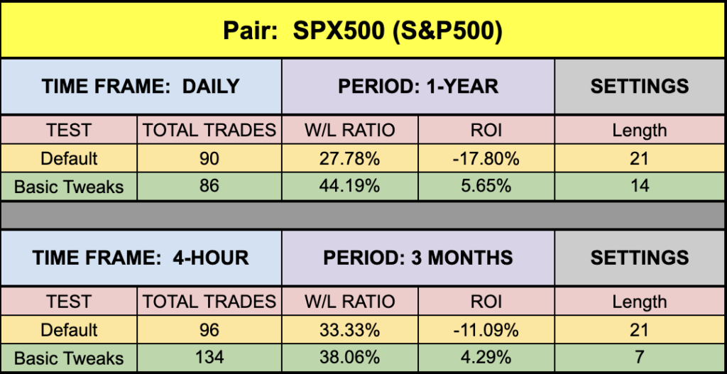 As No Nonsense Traders – and therefore Swing Traders, we will not examine shorter time frames in these studies. We will also run an additional test, using different values for the settings, to analyze which one may work better and examine the following results: