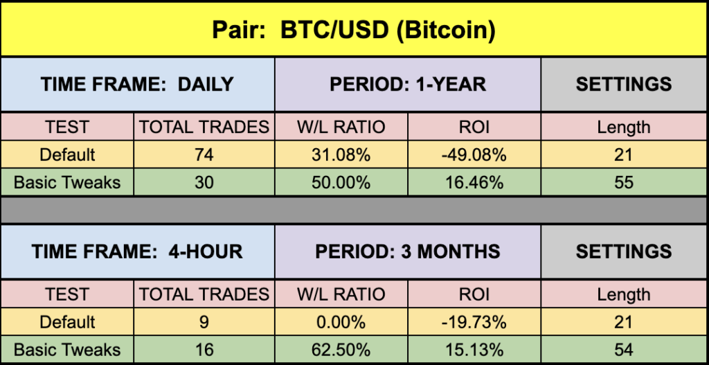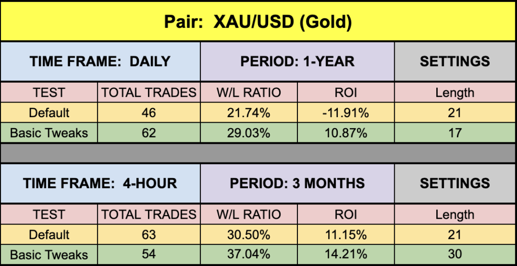 Interesting…for the first time, we were not able to find a winning combination for the EUR/USD for the time span tested. Does that always mean it won’t work? Not hardly. The market moves and shakes, and a time will come when it does work better on specific pairs. But if you’re a bitcoin or gold trader, this is a great one to experiment with!