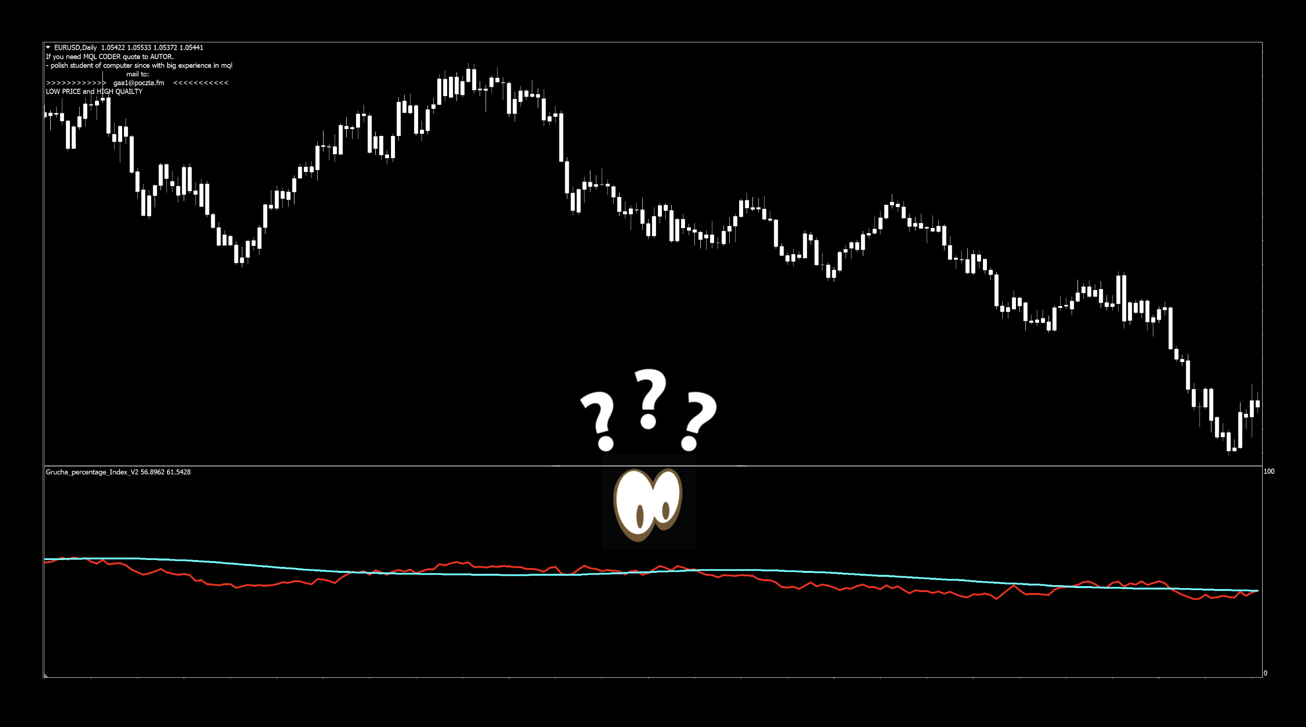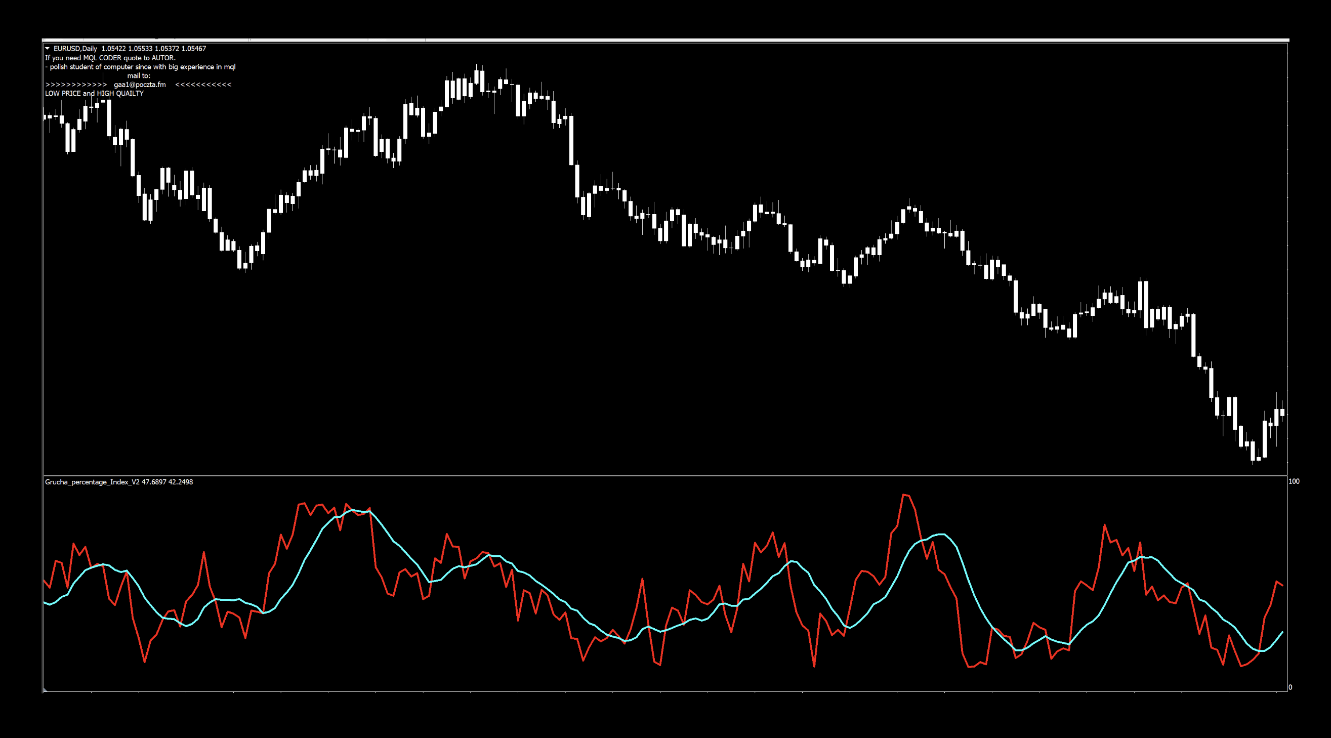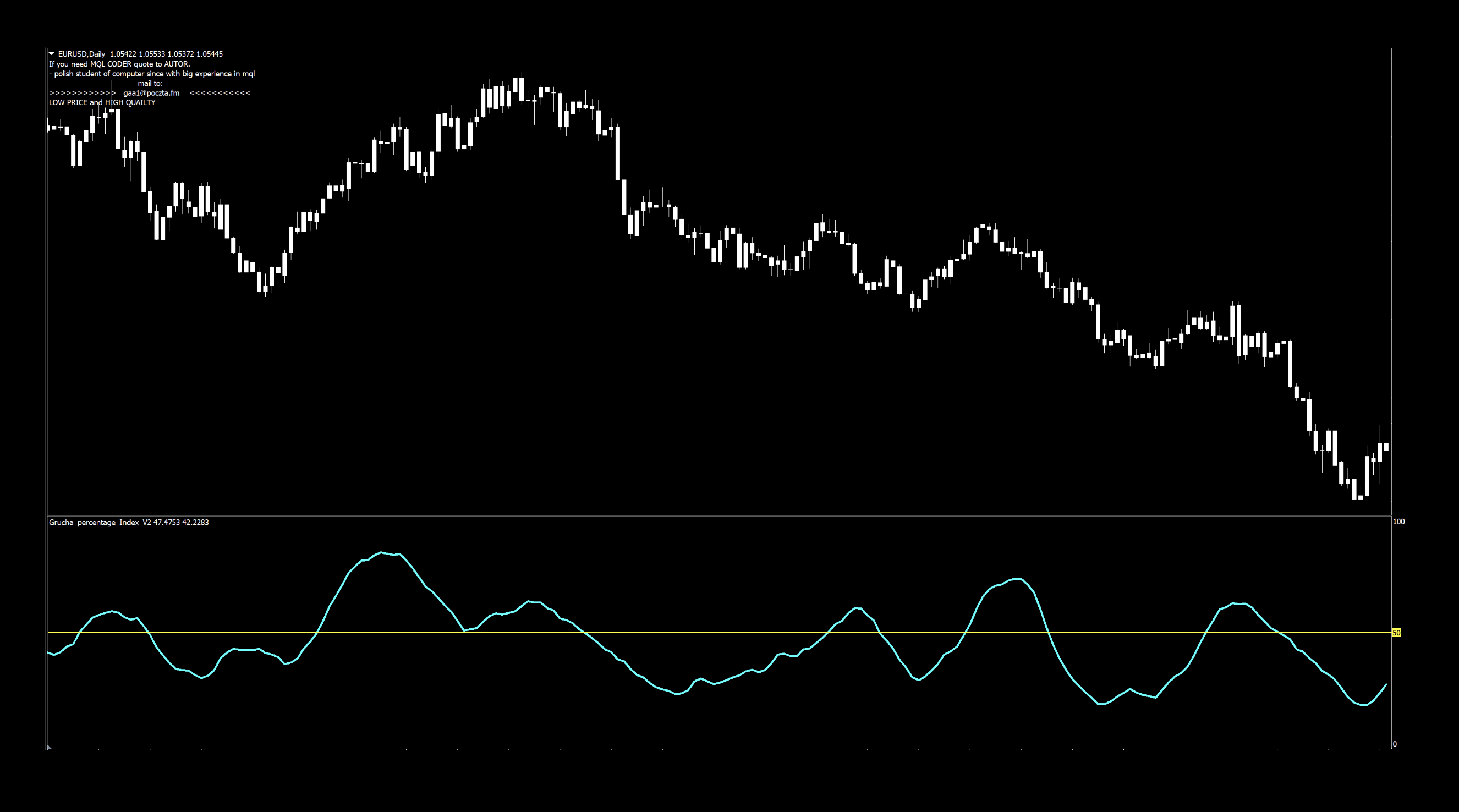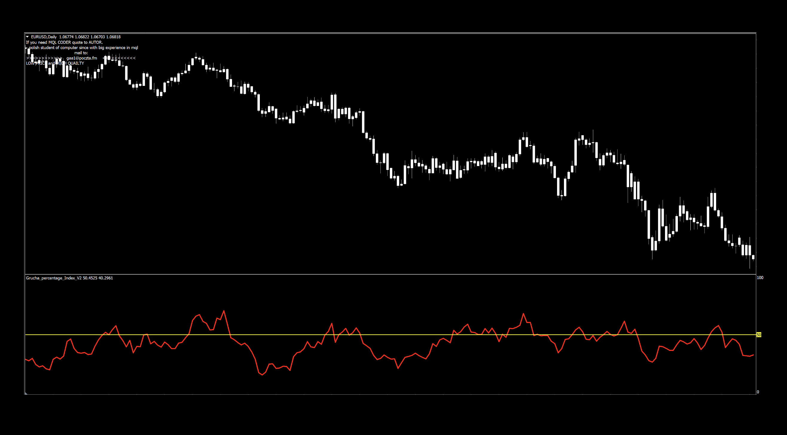 The indicator was coded by a Polish coder named Grzegorz Antosiewicz in 2011 who coincidentally advertises his skills right on the chart, once it’s loaded up. We found a few other indicators from this developer which we may investigate in future blogs, but we’ll start with this one.