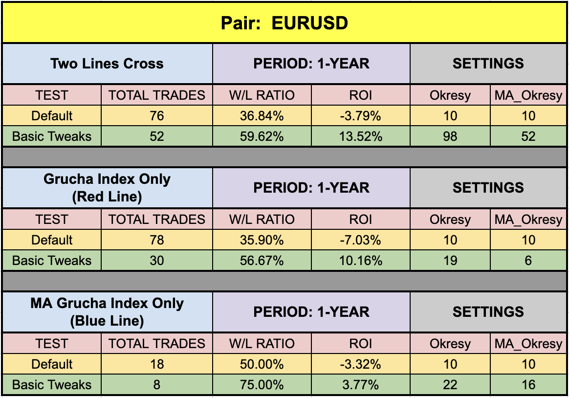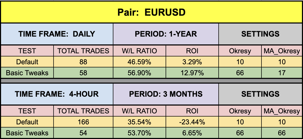 Okay, so the questions begs to ask. Which one is best? Do you want more signals to contend with, or something a bit easier to see? We ran random time span benchmark tests (default/tweaked) on the three possibilities, using the daily EUR/USD to make a decision. Here’s what we saw.