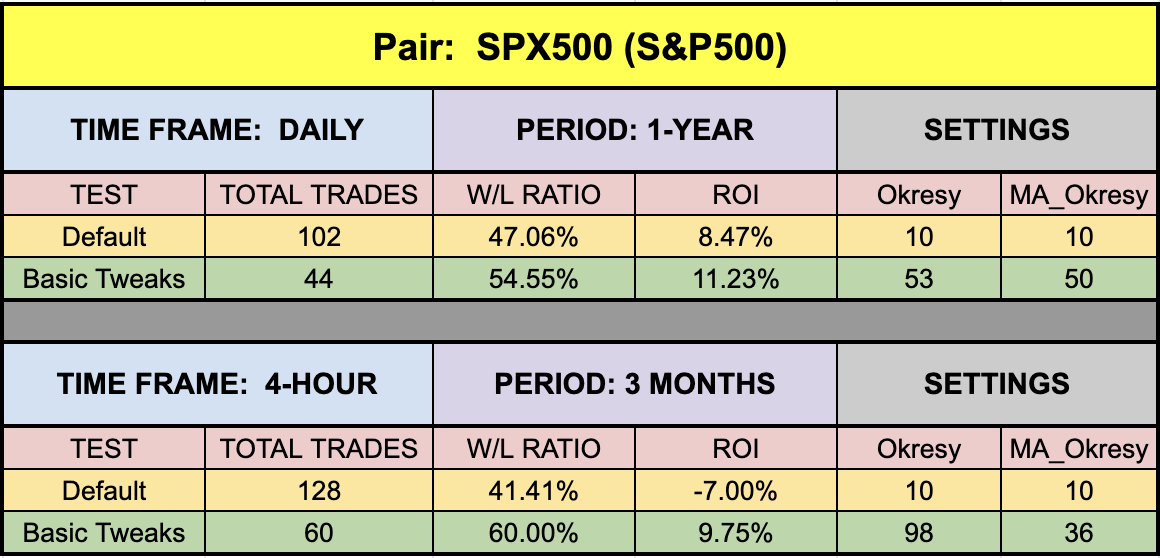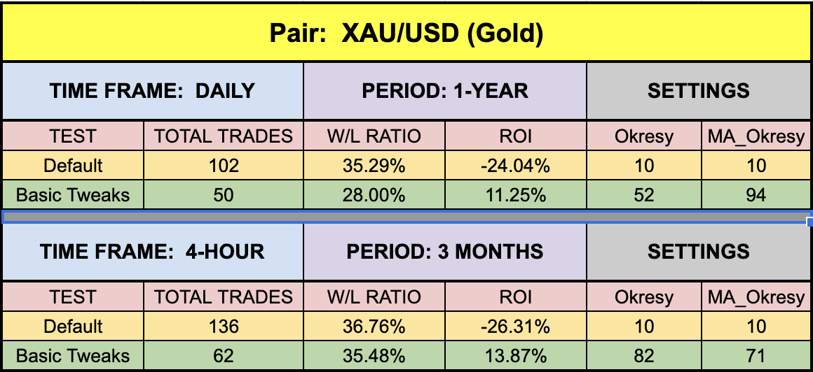 The green highlighted rows represent “basic tweaks” on the settings which returned better results. Are these the best? Not necessarily. Given that variables including testing date range and broker data are different from person to person, you may find better settings.