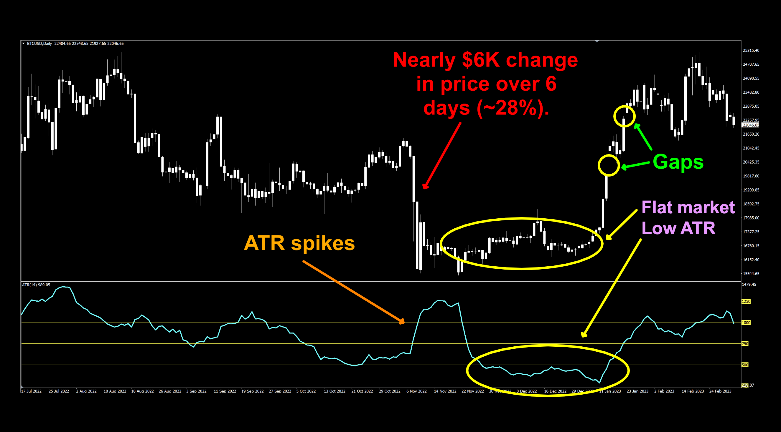 Daily ATR levels are on the right side (in yellow); $250, $500, $750, $1000, $1250 to demonstrate just how wide the ATR range really is.