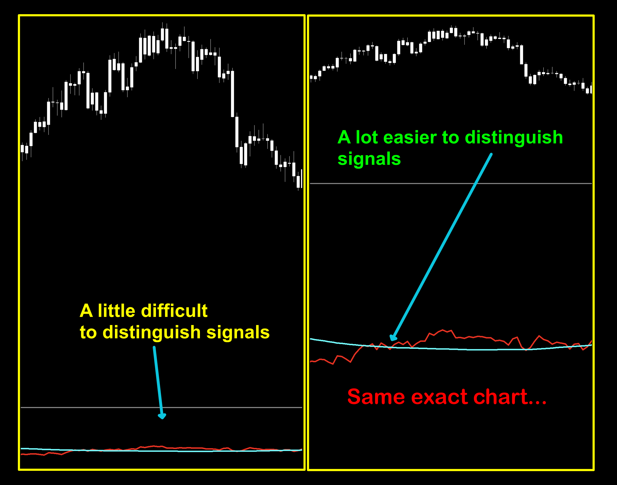 If you weren’t aware, you can actually “stretch” and compress the windows on your chart. We’ll demonstrate this feature by looking at a default view of the two lines cross (with flattened lines) then stretch it to get a better view of the signals lines. It’s helped us in the past, so I’m pretty sure it’ll help you as well. Check it out.