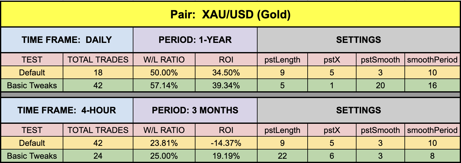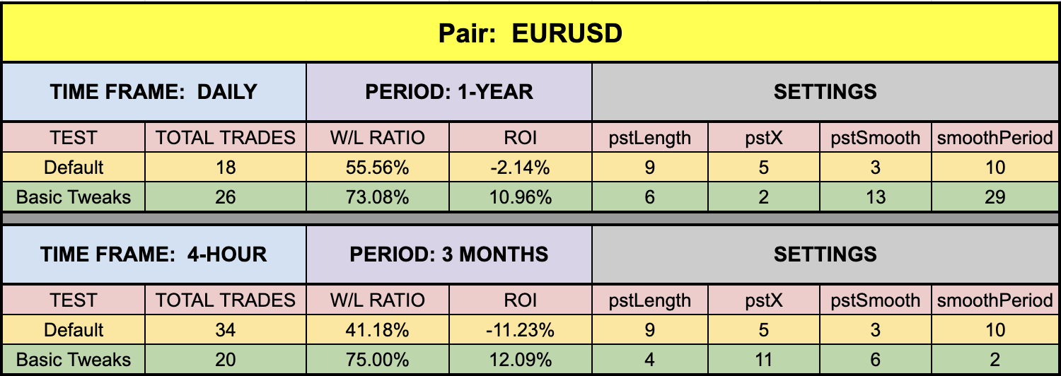 The green highlighted rows represent “basic tweaks” on the settings which returned better results. Are these the best? Not necessarily. Given that variables including testing date range and broker data are different from person to person, you may find better settings.