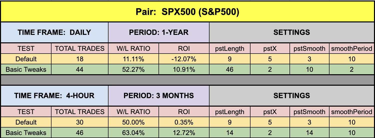 As No Nonsense Traders – and therefore Swing Traders, we will not examine shorter time frames in these studies.  We will also run an additional test, using different values for the settings, to analyze which one may work better and examine the following results: