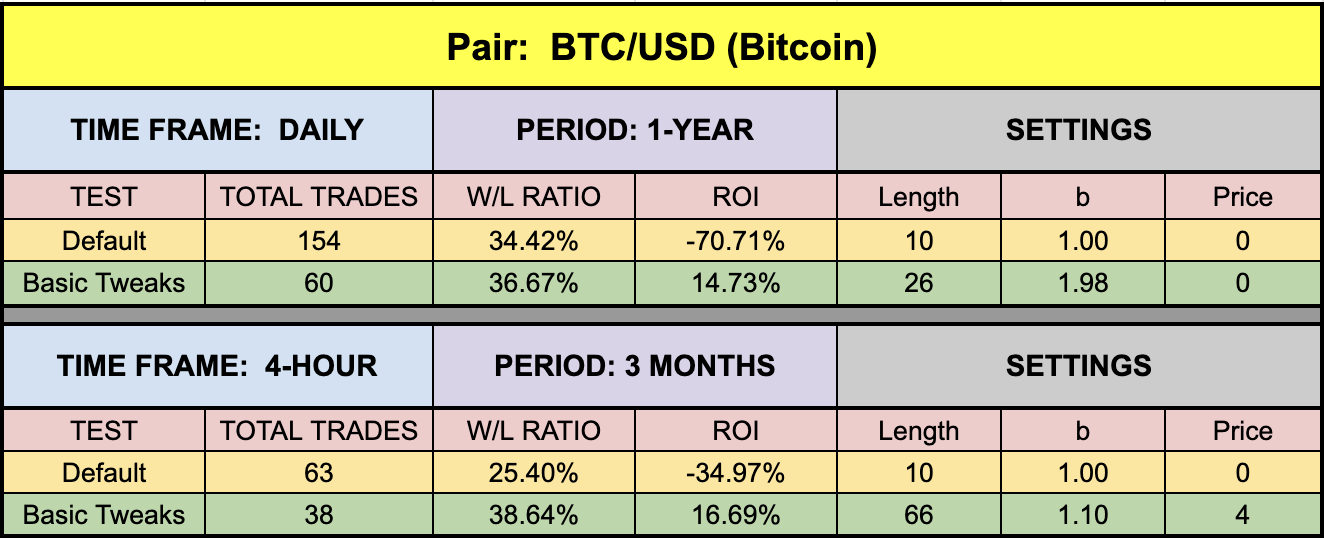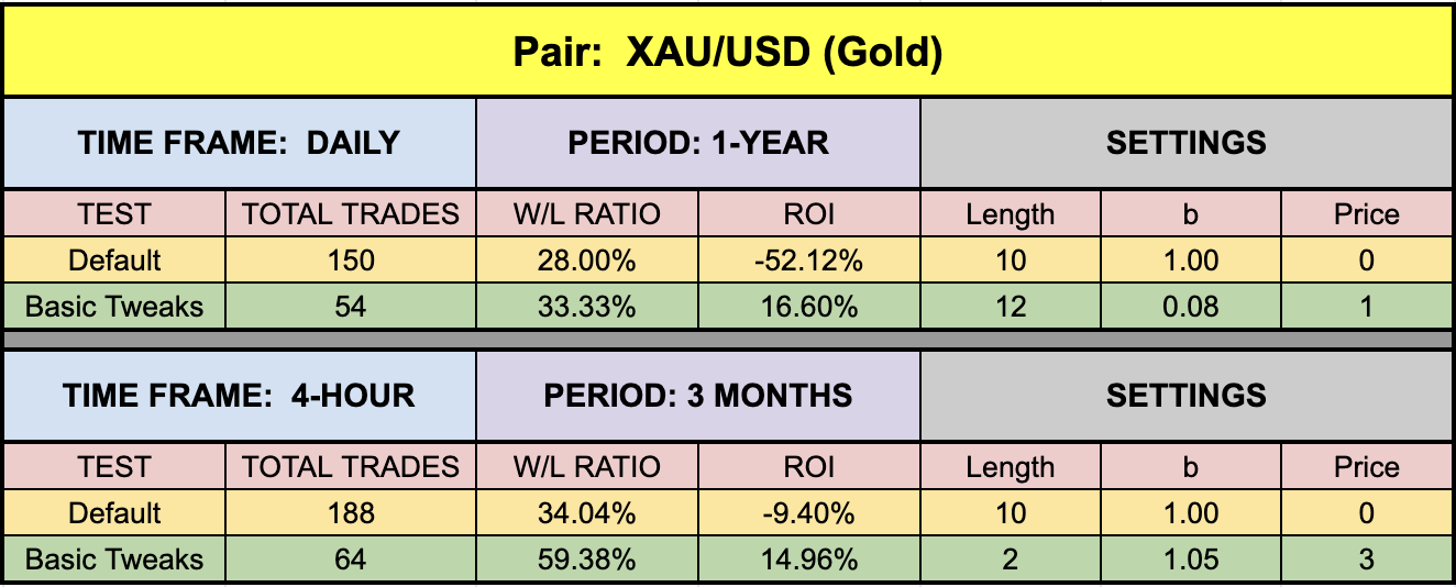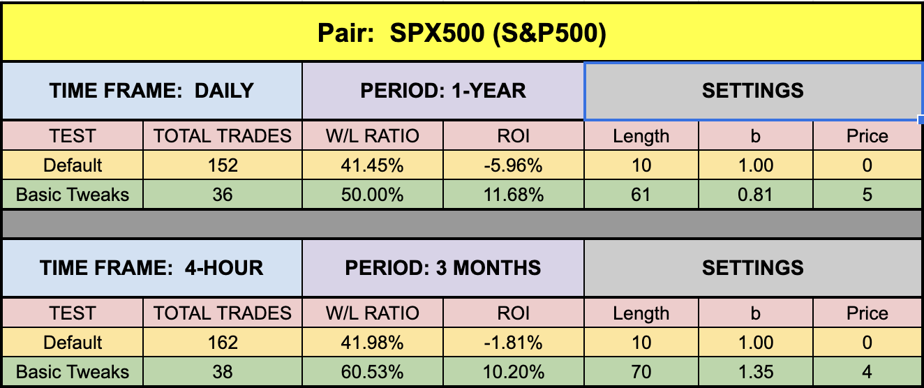 The green highlighted rows represent “basic tweaks” on the settings which returned better results. Are these the best? Not necessarily. Given that variables including testing date range and broker data are different from person to person, you may find better settings.