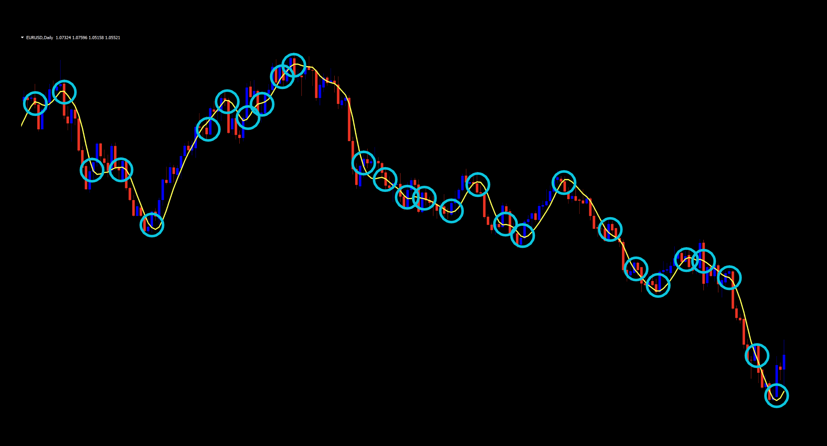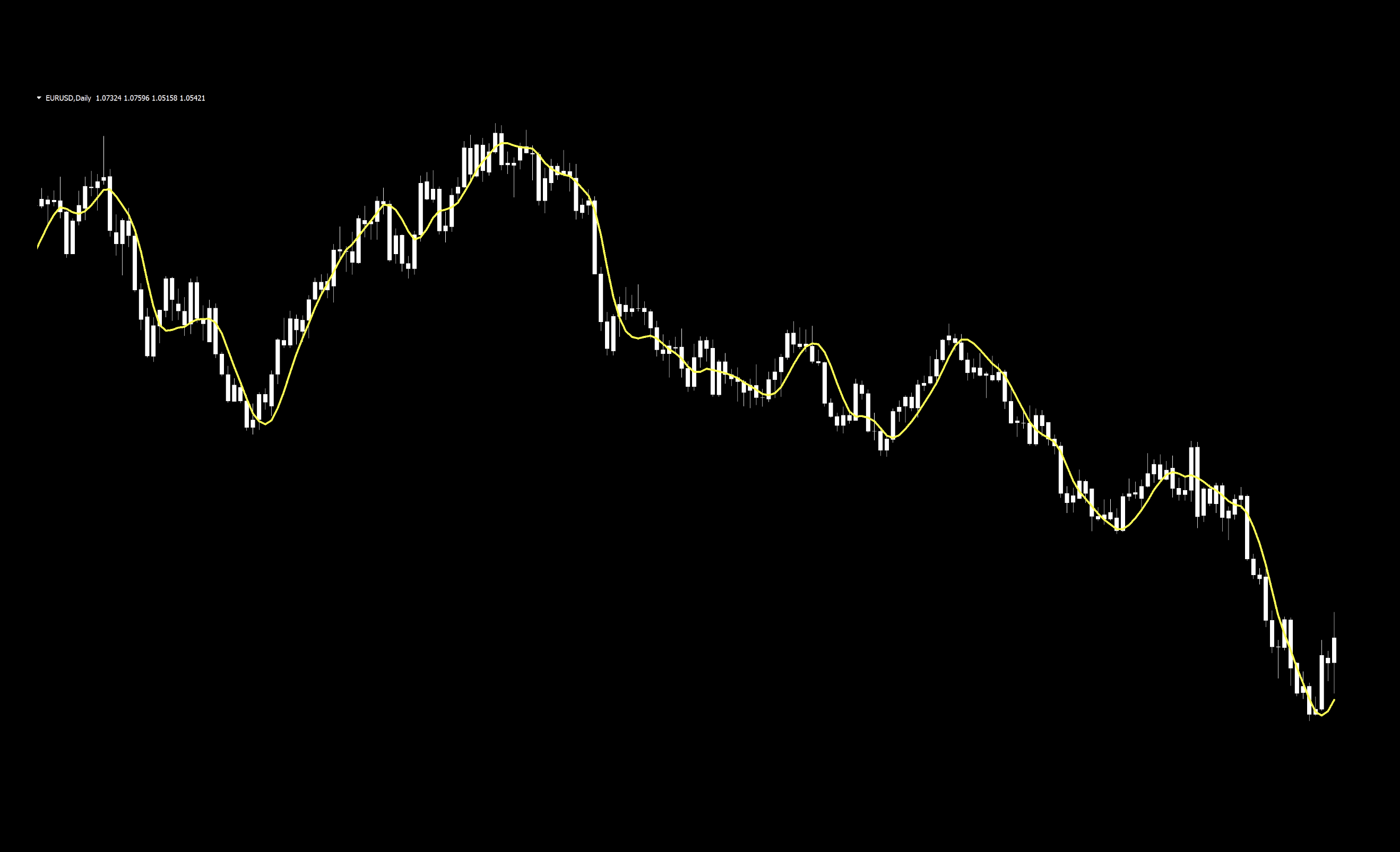 The default view of the indicator is pretty simple. Just a single line on the chart. We’ve made it a bit thicker (but left it yellow) for easier viewing. And naturally, the candles are white to give it some contrast and to remove any chart bias of colored candles. But we’ll change the candles shortly to see where the signals are.