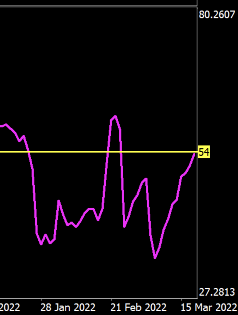 As previously mentioned, the midline is just an average of the upper and lower levels (added) and then divided by 2. Occasionally, you may have to change the level, but trading on the daily time frame prevents anything from happening so quickly that you risk missing anything significant. On our example, the upper range is 72.5 and the lower range is 27.7. Added together, you get 100.2 and divided by 2, the final result is 50.1…or just “50”.