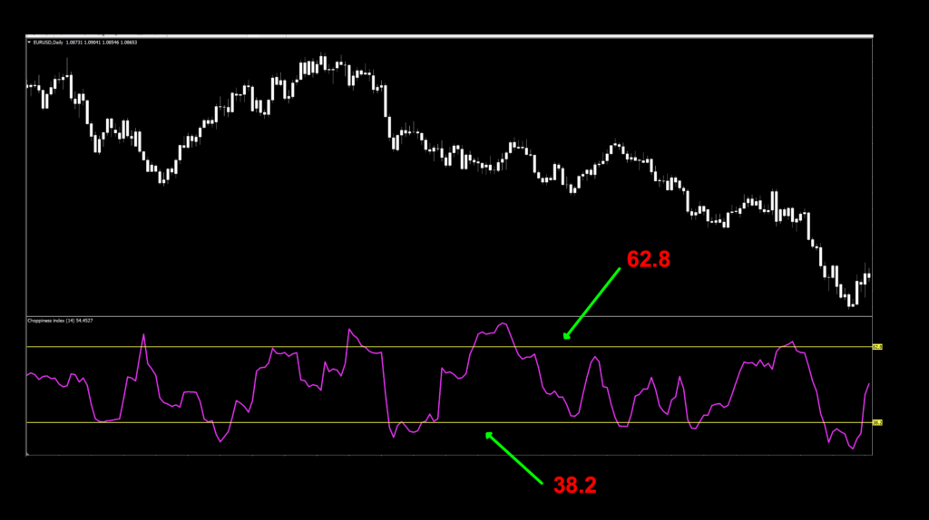 Before we get to the testing, we wanted to show you the “alternate” version of how you may want to use this indicator. Some use the Choppiness Index indicator to measure the market’s trendiness by using fixed values of 38.2 and 61.8. The market is trending when values are below 38.2 versus the market’s choppiness on values above 61.8. Those numbers look familiar…what are they? 38.2 and 61.8 are Fibonacci Retracement numbers, and that’s a discussion for another time.