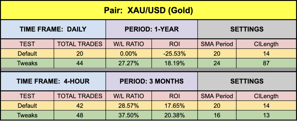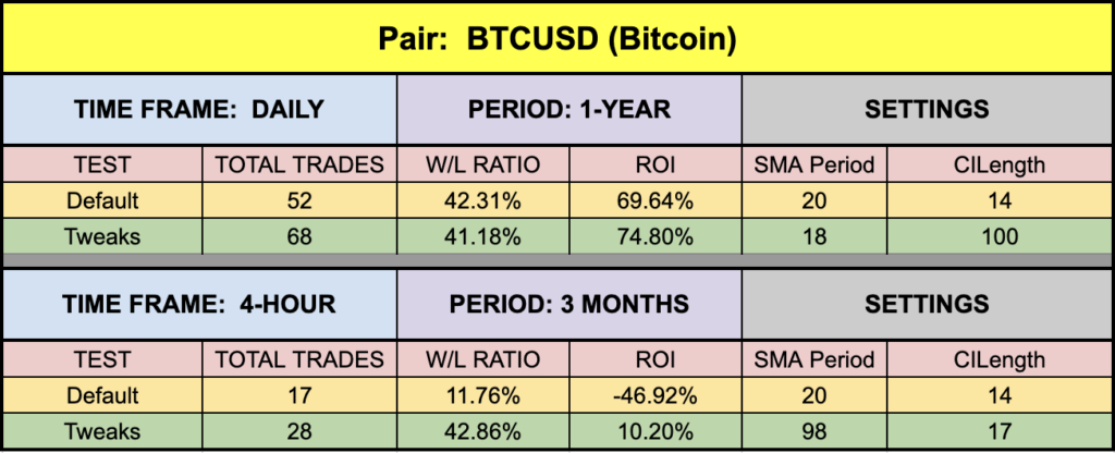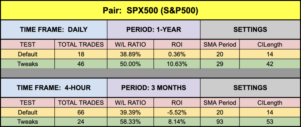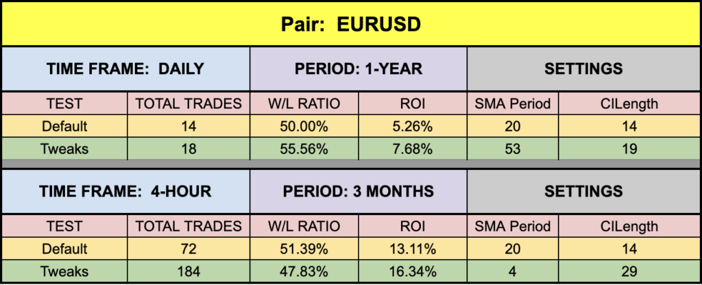 The green highlighted rows are the tweaks we applied to both the indicators as a combination. They are not fully optimized values as they change every day and therefore would make no sense. We’re just demonstrating indicators which can be made better. The settings are not to be considered trading advice. They are for educational and illustrative purposes only.