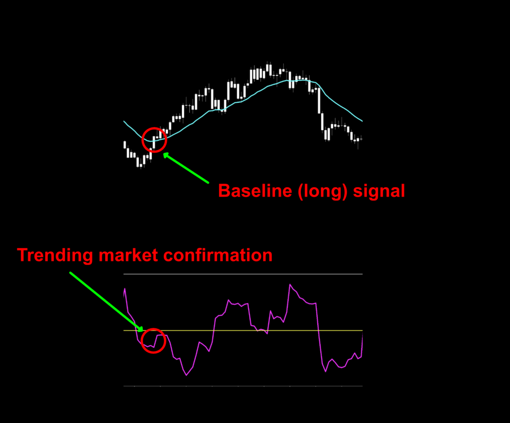 Once the market begins to trend (below the midline), you can start qualifying your other signals. What’s interesting is that this indicator appears to decipher the market as trending before the actual baseline signal. That’s a pretty good “heads up”.