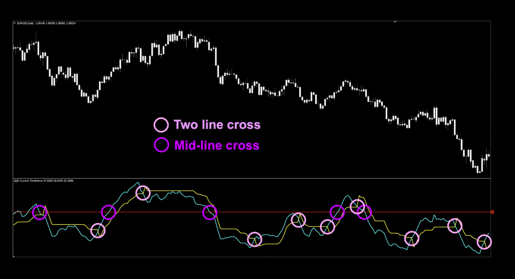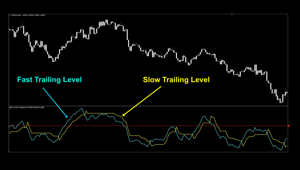 So, what is this mystery indicator?  None other than the QQE; or Quantitative Qualitative Estimation indicator.  This beauty is based on Welles Wilder’s RSI…but different.  This is another smoothed version of an indicator that calculates the absolute value of the change in RSI values between calculated bars and averaged twice.  Pretty slick!