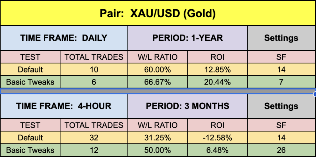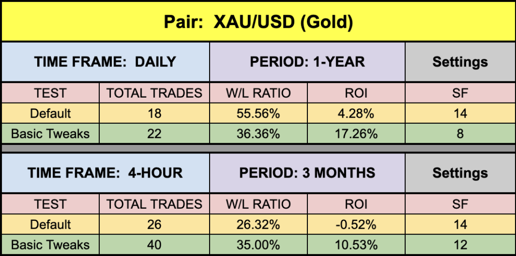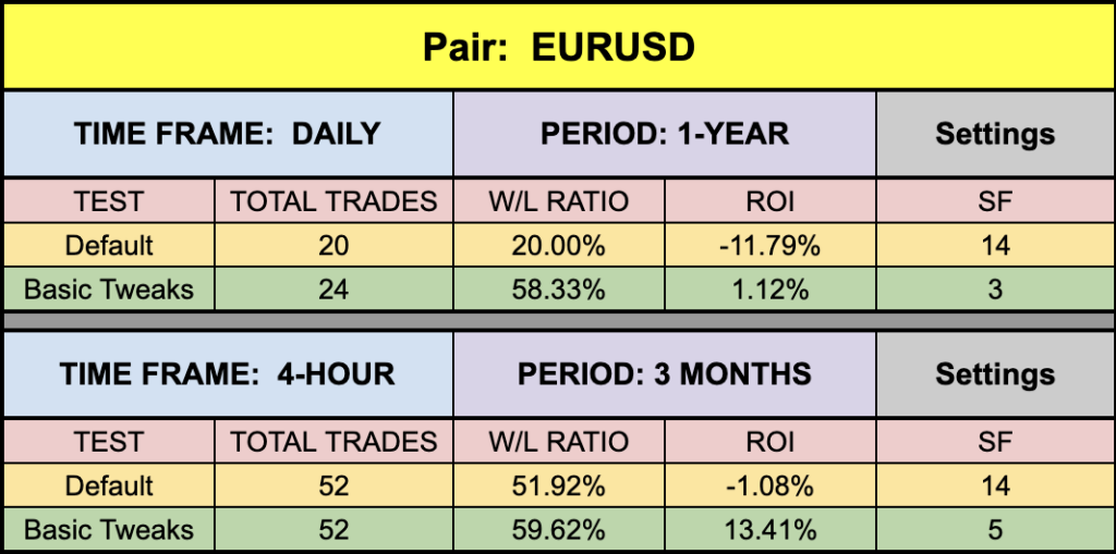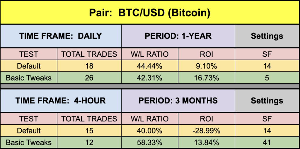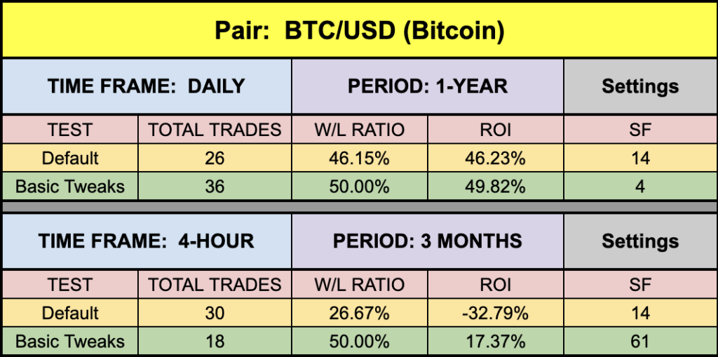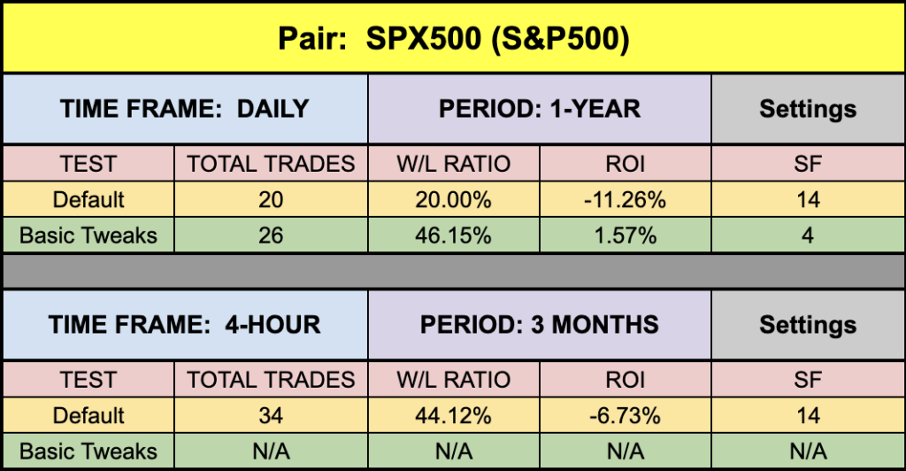 As we always like to mention, green highlighted rows are the tweaks we found which returned better results – but we never post fully optimized tweaks because numbers change every day.  We’re just demonstrating indicators which can be made better.  The settings are not to be considered trading advice – they are for educational and illustrative purposes only.