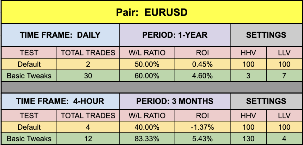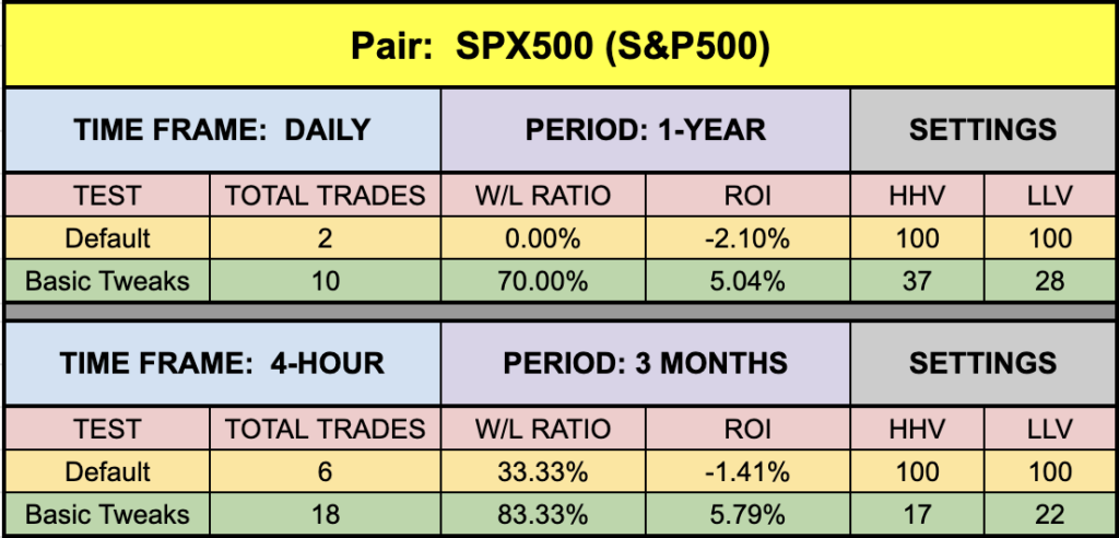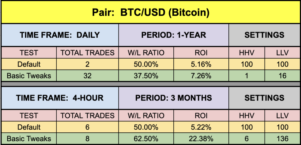 The default settings for this indicator returned very interesting results. That’s where we start. Then we try tweaking the settings. Sometimes they’re spectacular, sometimes ordinary. The point is, we’re demonstrating that they can be better than other indicators. The results we post are not necessarily the best because that may not be helpful beyond the time this blog is broadcasted. Market change and you need to be flexible. Never stop the journey for better algorithms. Your bank account will (hopefully) be thankful for your efforts.