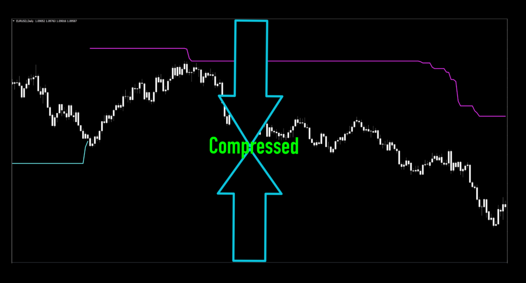 You may have noticed that the red line seems to extend past the screen. The natural aspect ratio of the chart affects this phenomenon. But, MT4 (as most charts are able) permits you to “squish” or compress the screen to change the field of view. We did just that below to see what the whole signal looks like.