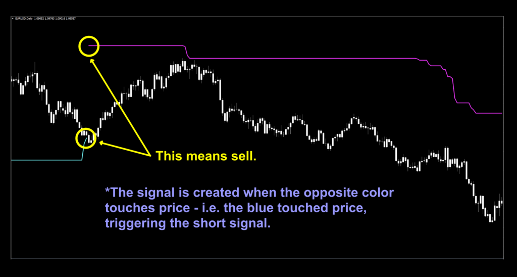 Short signal: When the blue signal line touches price, the red line is created above price. Entry is on the open of the next period