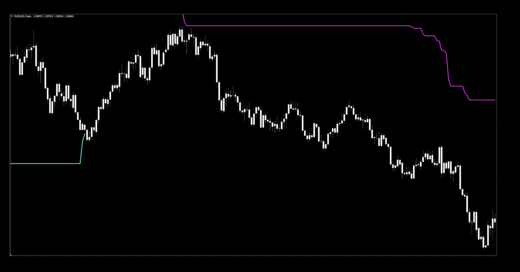 Better, no? Now we can see how the two signal lines work in concert with each other. One line touches price, indicting an opposite signal has been triggered.