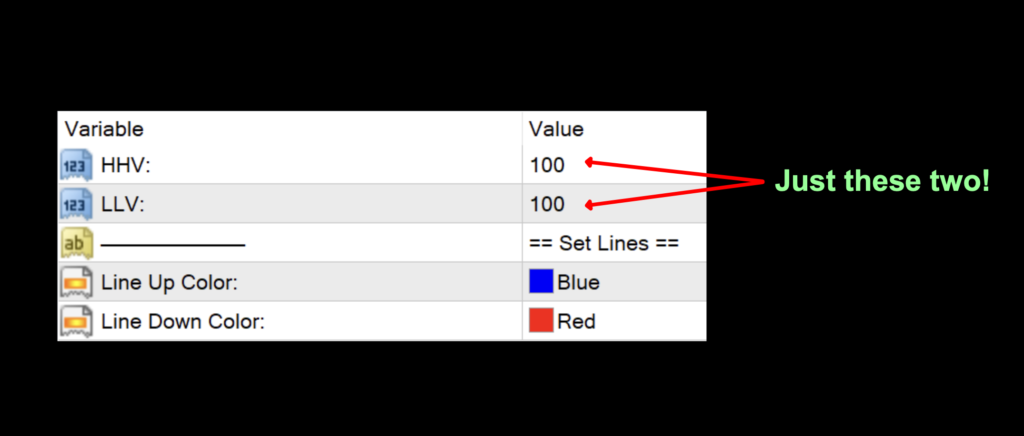 HHV: This is the High High Value used to calculate the long signal line. It has a range of 1-200 and the default settings sits right in the middle at 100.