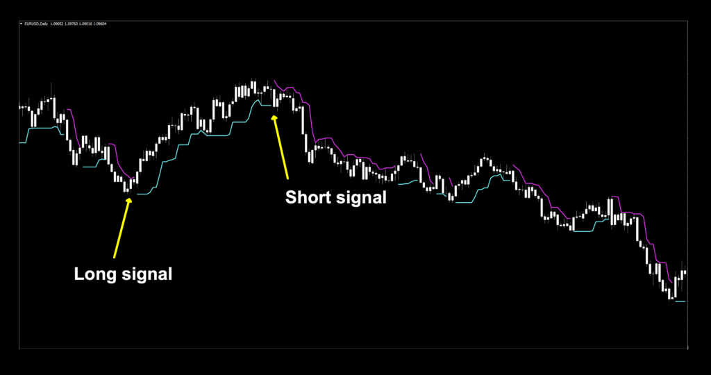 Long signal: When the red signal line touches price, the blue line is created below price. Entry is on the open of the next period.