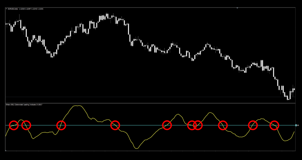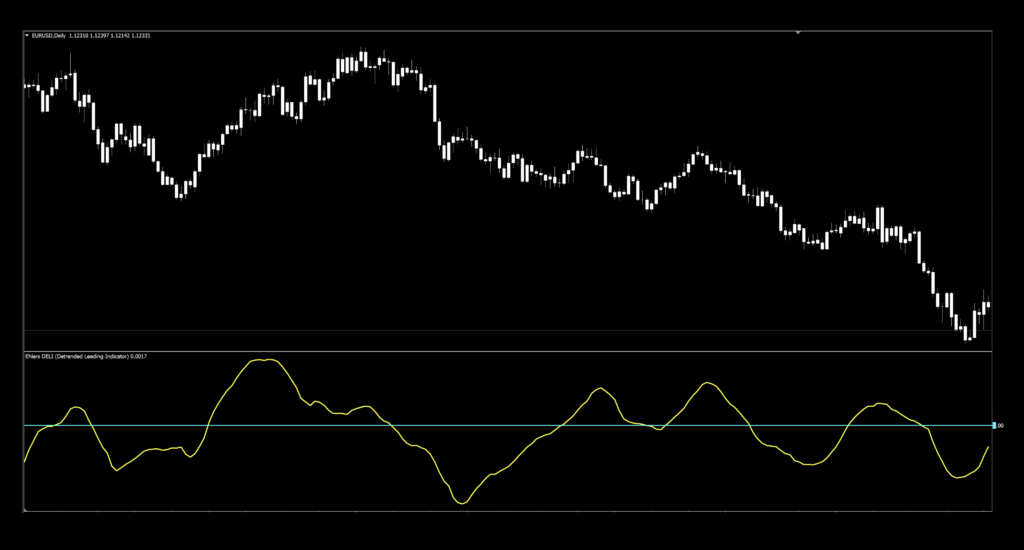 The search began heading in a totally different direction then, as we started down that particular rabbit hole, something else just kind of popped up. So naturally, we put it in reverse to check it out. That being said, this week we’re going with an indicator called Ehlers DELI (Detrended Ehlers Leading Indicator) – a below chart zero line cross confirmation indicator. The indicator itself is not the direct work of Mr. Ehlers, but its descendant. It was modified through the work of Bill Mars and subsequently coded into our world in 2015.
