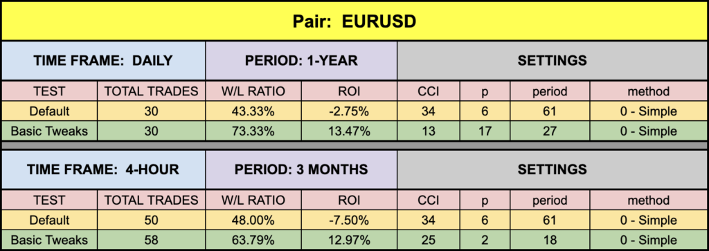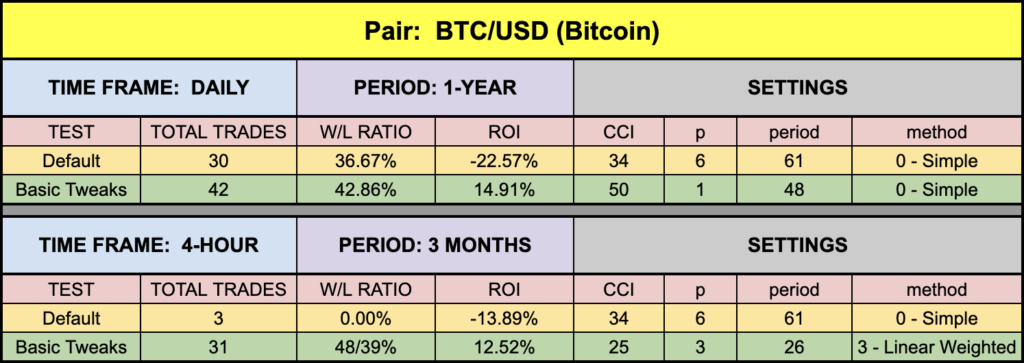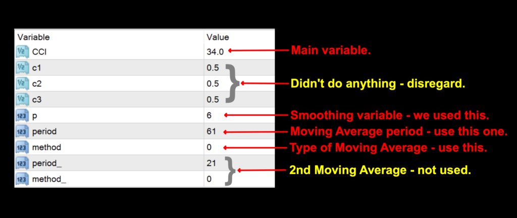 The only settings we used for testing were the CCI setting, the “p” setting, and the first period and method settings. We did not use the second moving average, nor “c1, c2, and c3” settings. They appeared to make no changes to the signal lines, and we could not access the indicator’s code.