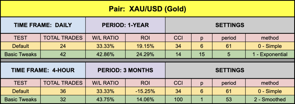 Generally speaking, the tweaked values were very consistent. Overall, we were pleased. Of course, gold traders would be riding high, even on the default settings – always a bonus. Remember, the results we post are not necessarily the highest in any category because that’s just not helpful beyond the date of the blog. Market conditions change and you need to be vigilant of that. Never stop looking for better indicators for your algorithm.