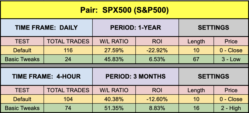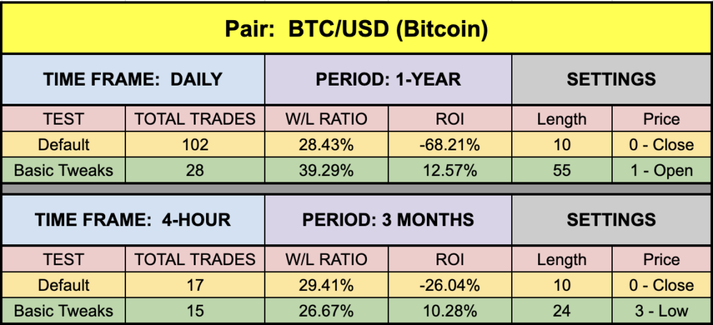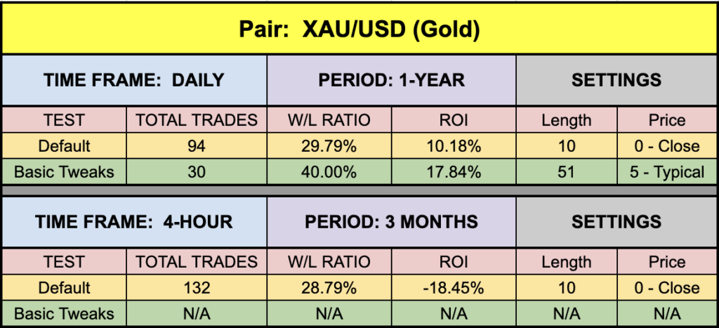The first thing we noticed is how many signals were given on the default settings, save the 4-hour BTC. This really wasn’t a surprise, considering that the indicator naturally reacts quickly to price action. In every circumstance, we had to “slow” down the indicator’s math to get better results. Unfortunately, for 4-hour gold, there were no combinations using our criteria during the testing period which resulted in a positive return. That’s fine, we move on.