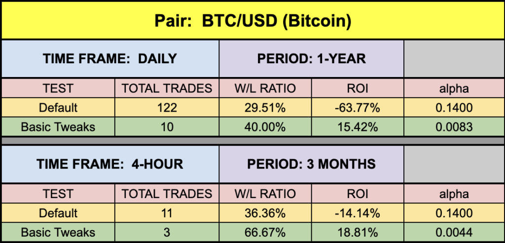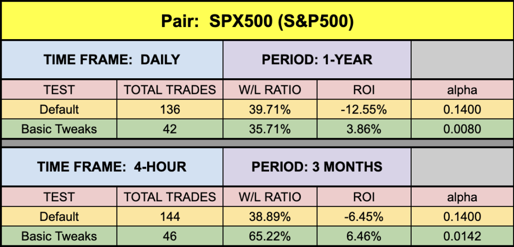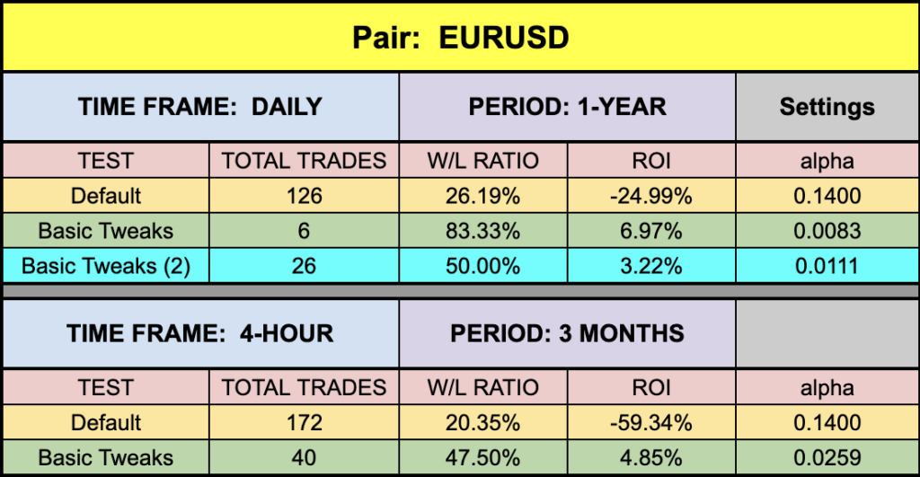 The one thing you’ll notice in the EUR/USD testing sheet is the additional data set in a pretty aqua blue. We wanted to mention that there are trade-offs which you must take into consideration when tweaking indicators. The first tweak yielded a higher ROI and W/L percentages, but fewer trades. We also included a second set of tweaked setting which would have netted less ROI and W/L percentages, but more trades.