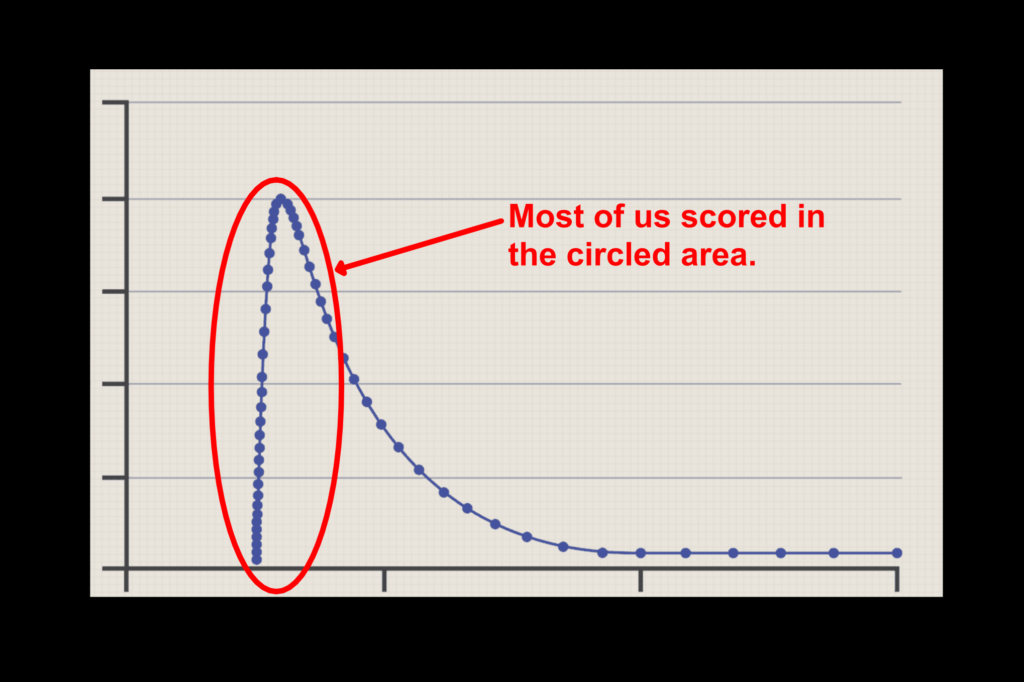 Some people have a “bell curve” story, usually involving an incident with the classroom. If you bear with me for just a moment, I’ll tell you the one that has stuck with me for decades. I was a student in an engineering class a long time ago where the teacher was exceptionally intelligent…and most of us were a bunch of sophomoric knuckleheads. We all took a test and scored so poorly that the highest score was a dismal 29%. The professor was actually laughing as he displayed our scores as a bell curve on the screen. It kind of looked like this.