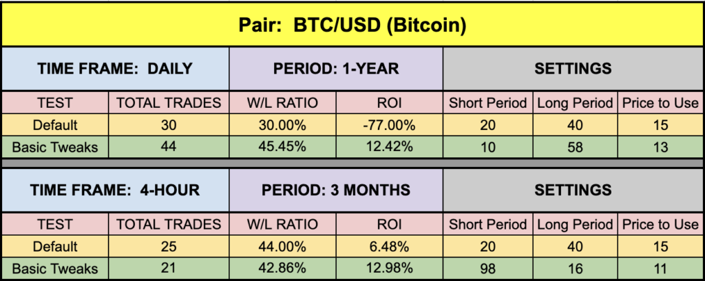 Overall, not too bad.  The default numbers on BTC were incredibly poor, but we were able to find tweaked settings for redemption, so we were pleased about that.  XAU was the clear winner here with stellar default values and even the EUR was able to swing pretty decent numbers, especially on that killer win/loss percentage.  We think this indicator definitely deserves a little of your time, so head on over to the library and download a copy for yourself.  Happy hunting!