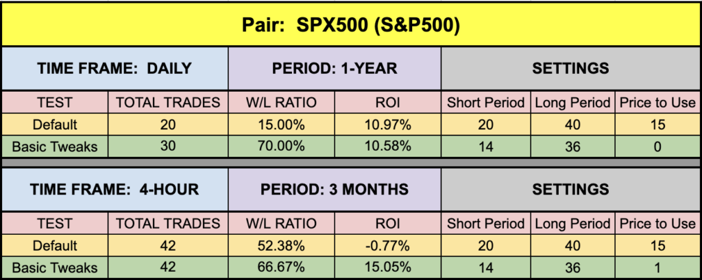 We’ll run the Correlation Trend indicator on the EUR/USD, BTC/USD, XAU/USD, and the SPX500 using the default and tweaked settings across the daily and 4-hour timeframes on the MT4 strategy tester.