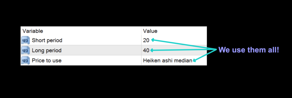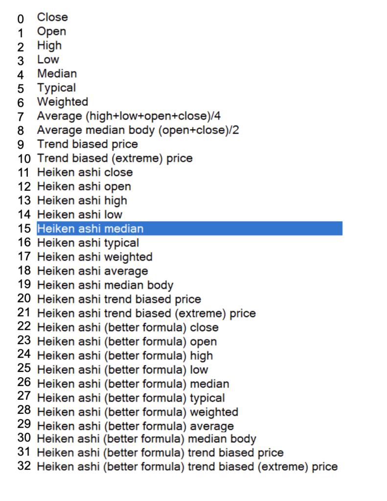 Price to use:  The price data set used for the internal calculations.  The default setting is 15 – Heiken ashi median.  The below image identifies all 33 types of prices you can use.