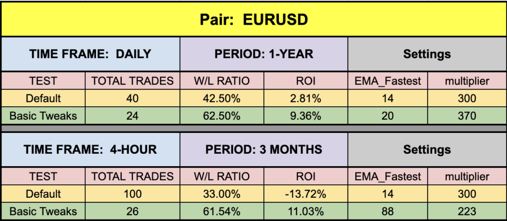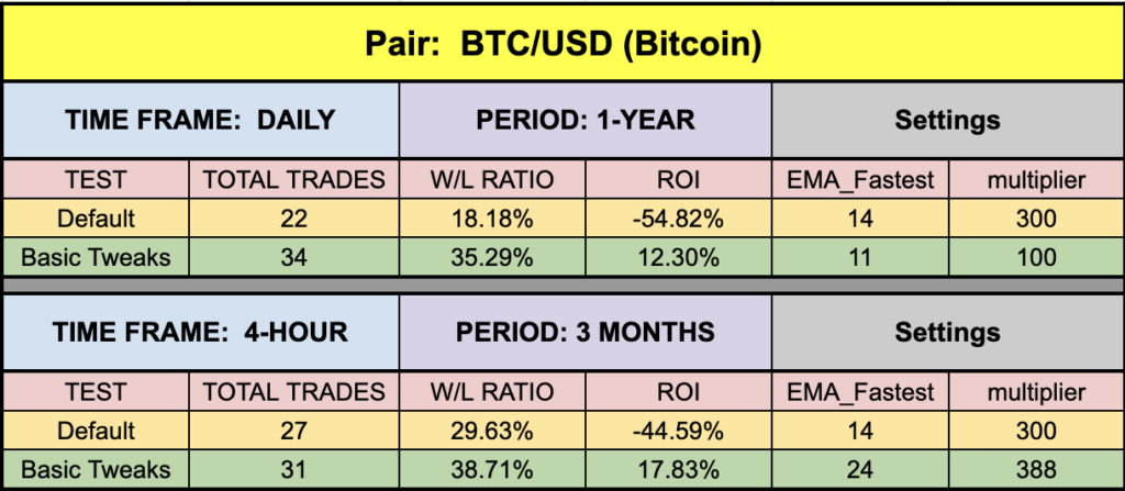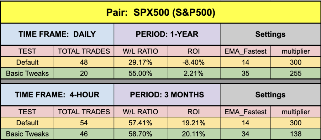 We were able to get some pretty decent numbers across the board. Notice that the EUR on the default values was above the waterline, a sweet beginning. Good across BTC and XAU, but a little low on the daily SPX500. For you 4-hour indices traders, you’d definitely want to make this part of your testing regime. I mean, look at those default metrics. Pretty hot stuff!