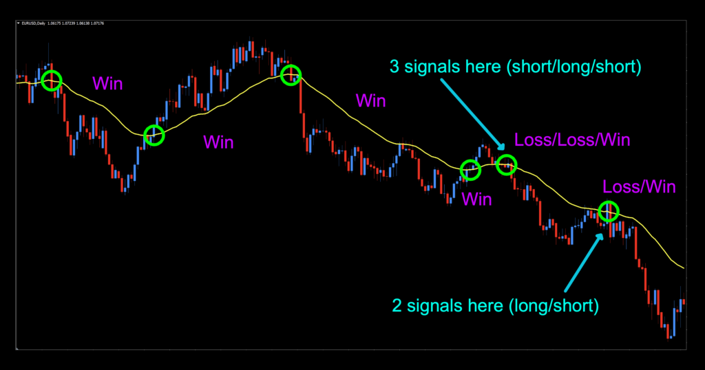 Short signal: When the signal line crosses below price. Entry is in the last 30 minutes of the trading day.