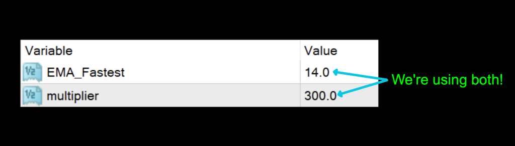 EMA_Fastest: The main variable for the internal calculations. The default value is 14.0 which, coincidently, is the same value we use when calculating our stop loss and take profit levels based on the ATR. Pretty neat.