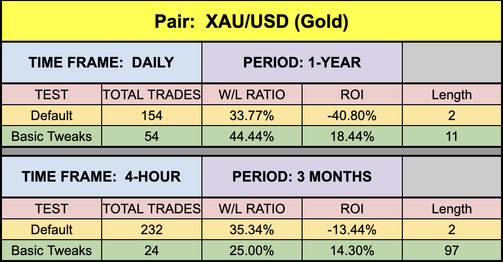 All that aside, we were able to make it better in all cases. Not mind-blowing, but definitely worth a little time for testing on our own. BTC and XAU were neck in neck although the default values for BTC ROI% was so incredibly bad. Funny how just a little tweak can help.