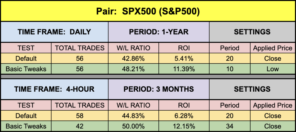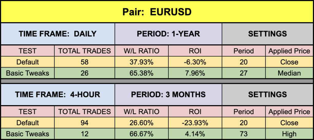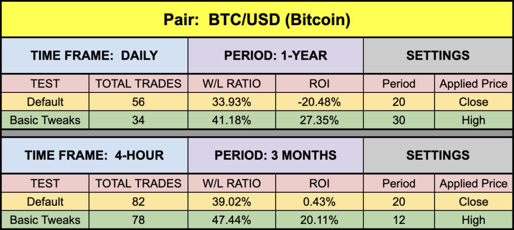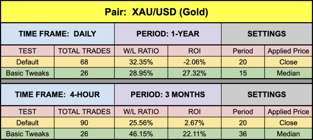 Like all the baselines we’ve been examining, this one is a nice citrus yellow for easy visibility. Candles are a chromatically pleasing blue and red to see where the entries are, but other than thickening up the signal line for better visibility, everything else is right out of the box.