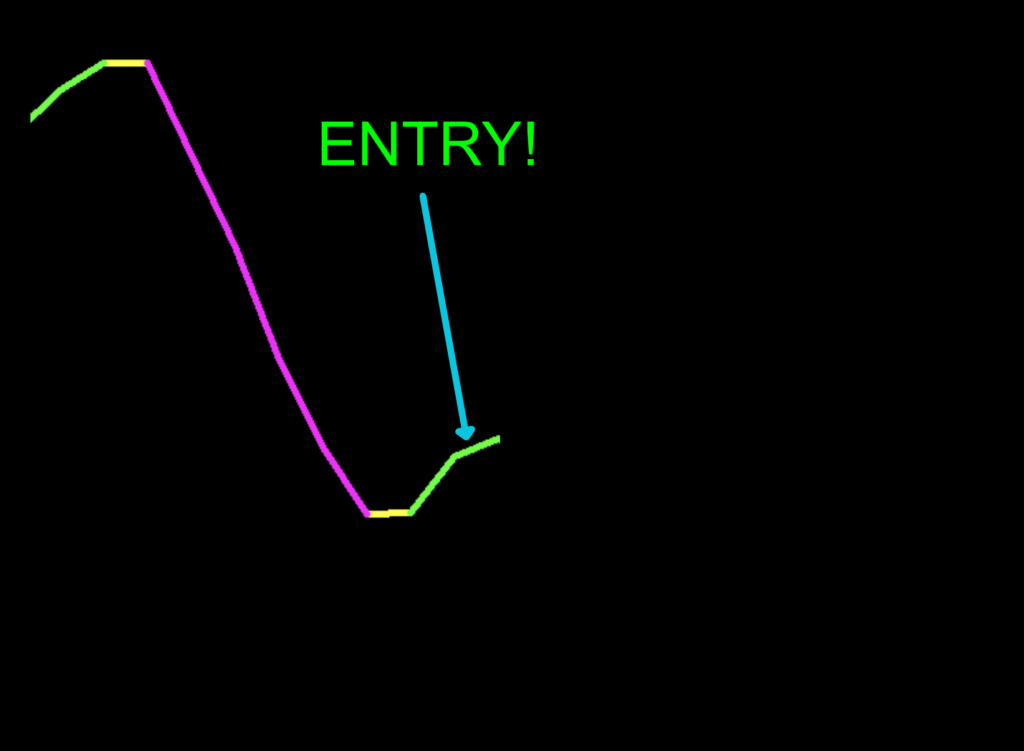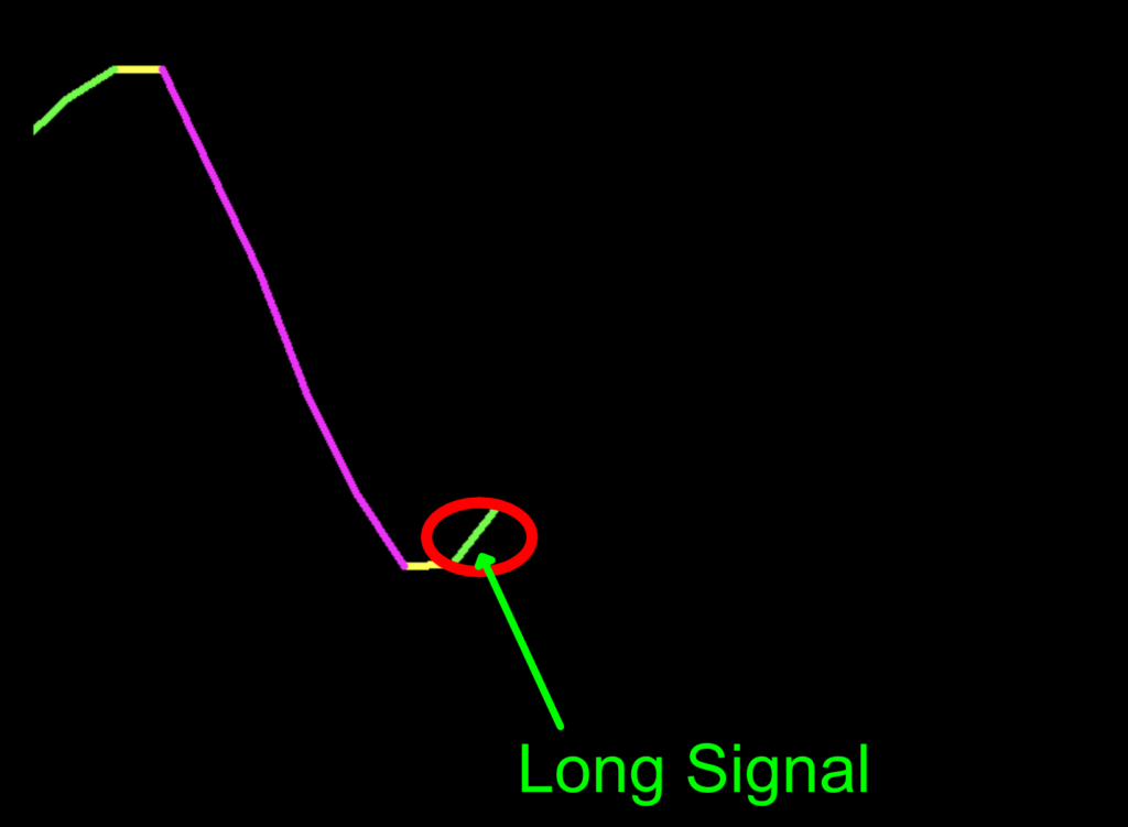 In the sixth image, we’ve got a green candle indicating that a potential long signal is coming, but we do not enter until the candle closes, and the condition is verified.