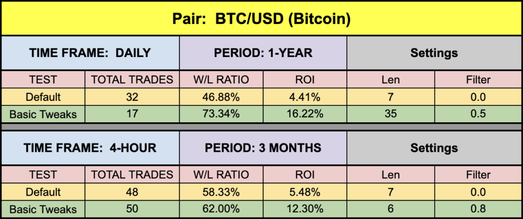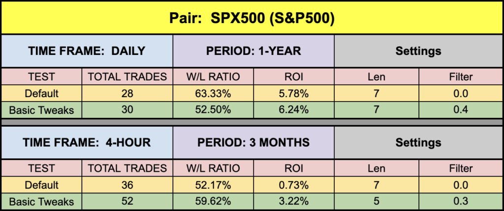 Looking through the results, the Euro was average(ish) and the S&P returned somewhat soft results, but BTC and XAU did pretty well. Remember, these are not the most optimized settings because that’s not the purpose of what we do. The numbers we post just give you an idea of the indicator’s capabilities. As the market flexes, results will indeed go up or down and naturally, and how this indicator meshes with your algorithm will dictate your personal return on investment.