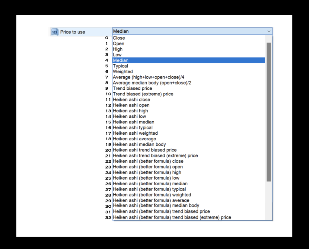 Price to use: The specific price data set for the Glitch Index calculations. The default value is 4 — Median. You have 32 choices.