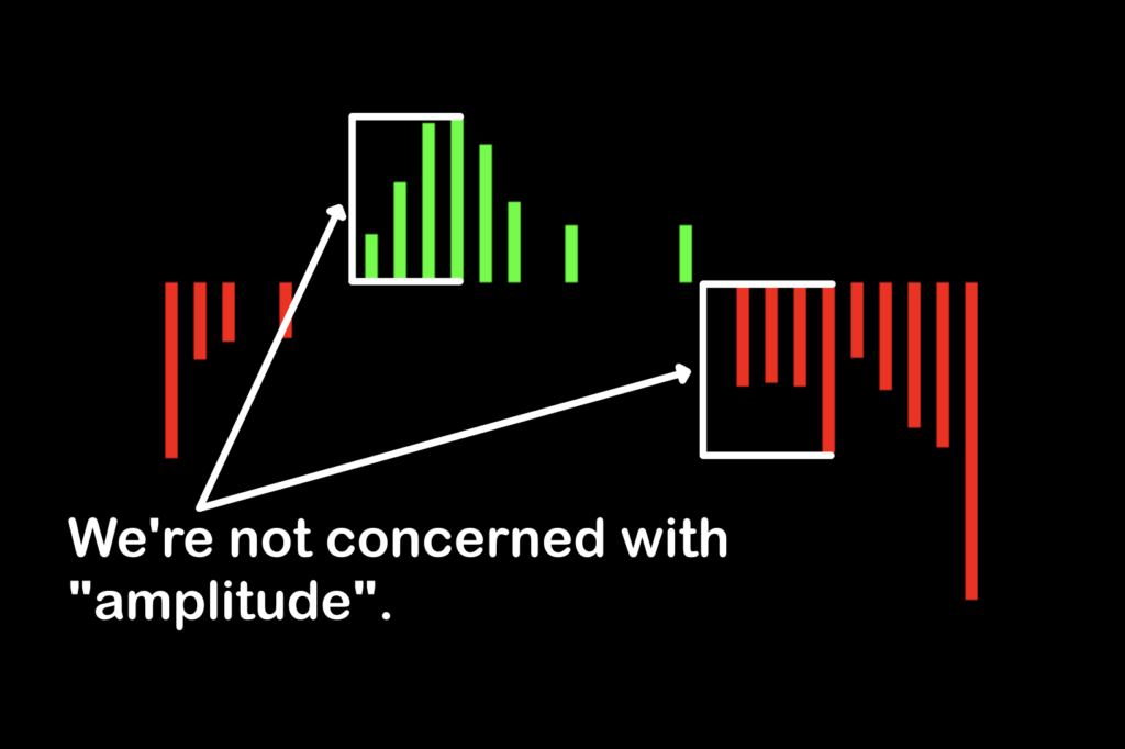 One remaining note we need to mention is the amplitude, or height, of each bar. Bottom line, it’s irrelevant…meaning that the perceived strength of the bar is not one we’re concerned with, only the color.